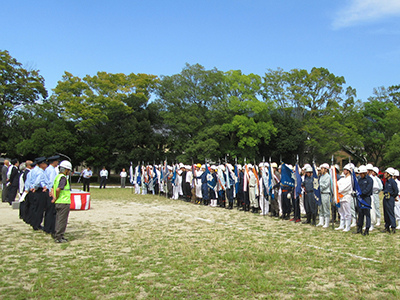 当日は、秋晴れの訓練日和で、他の左京区管内の自衛消防隊と、日頃の訓練成果を披露するとともに自主防火・防災の必要性について再認識しました。
