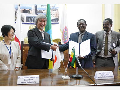 このたび、山極壽一 総長と稲葉カヨ 理事・副学長がエチオピアのアディスアベバを訪問し、アディスアベバ大学との大学間学術交流協定調印式や京都大学アフリカ同窓会総会に参加しました。今回の訪問には、重田眞義 アフリカ地域研究資料センター長、太田至 アジア・アフリカ地域研究研究科長、舟川晋也 地球環境学堂長ら、アフリカ研究に携わる学内関係者も多数同行し、新旧の交流を温める貴重な機会となりました。