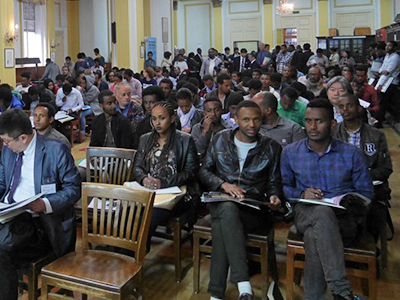 午後からは、北海道大学が主催する日本留学フェアが同じ会場で開催されました。日本の大学への留学に関心を持つアディスアベバ大学の学生が会場を埋め、本学の個別相談ブースにも70名以上の参加者が訪れました。