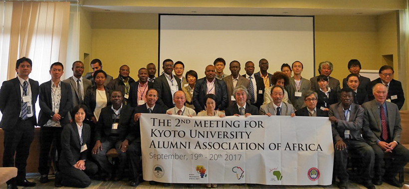 その後、本学一行は市内にあるホテルへと移動し、京都大学アフリカ同窓会総会に参加しました。昨年ケニアのナイロビで開催された同窓会準備会に続き、今回もアフリカ9カ国出身の卒業生13名およびアフリカで活躍する日本人卒業生4名が参加しました。開会の挨拶で、稲葉理事・副学長が今回初めてアフリカを訪問したことを告げると、同窓生からは盛大な拍手が起こりました。また、アフリカ出身の同窓生は、今後の具体的な活動として、本学とアフリカの大学における教員・学生の相互派遣や共同研究の促進、またアフリカの研究機関と連携したコンソーシアム形成などの目標を発表しました。山極総長は、アジアやアフリカには野生動物や気候変動など、日本や欧米にはないユニークな研究課題があり、今後も独自の研究を継続していくためには双方向の交流が必要である、と述べました。