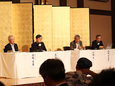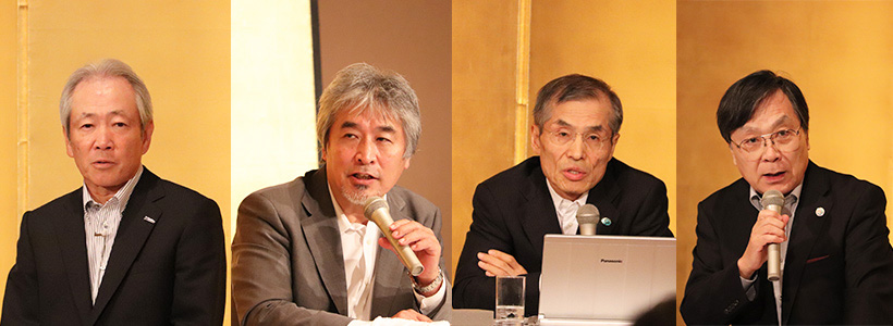 シンポジウムでは、阪本浩伸 日本経済新聞社常務執行役員大阪本社代表による挨拶の後、 高崎秀雄 日東電工株式会社社長からテーマに関する同社の取組み等の紹介があり、続いて、武田廣 神戸大学学長、山極総長、西尾章治郎 大阪大学総長から各大学の取組みや特色についてプレゼンテーションが行われました。その後、品田卓 日本経済新聞社執行役員大阪本社編集局長をモデレーターとして、高崎社長と武田学長、西尾総長、山極総長の 4名によるパネル討論が行われ、産業界からは、大学の人材育成に係る取組みを詳細に知る機会の必要性について、一方、大学からは、長期かつ包括的な組織間連携や研究スピードおよびルールの産学間での適合の重要性について話されました。直接、産業界と大学がそれぞれの人材育成などの取組みについて対話できる貴重な場となり、関西地域の特性を活かしたイノベーションや人材育成の必要性を共有し、盛会のうちに終えました。