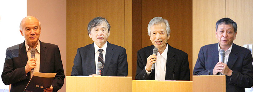 左から、挨拶する大西会長、梶代表幹事、趣旨説明する吉田特任教授、総合司会の東野教授