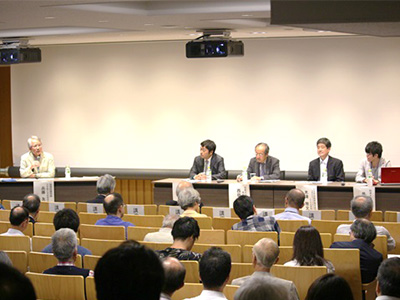 講演後は、兵藤友博 立命館大学経営学部教授をコーディネータとして、講演者全員による全体討論が行われました。そこでは参加者からの質問に答える時間を設け、参加者からの鋭い視点による疑問と、対するパネリストからの興味深く丁寧な解説の応酬に、会場は熱気に包まれおおいに盛り上がりました。その後、東野輝夫 大阪大学情報科学研究科教授が閉会の挨拶を行い、盛況のうちに終了しました。
