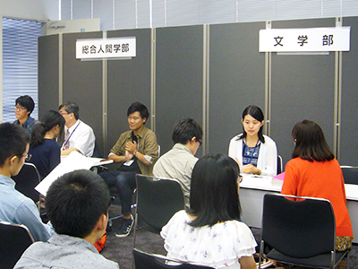 併設された個別相談コーナーには、関東地区出身者を中心に10学部すべての本学在学生が参加し、受験生、保護者からの質問に答えました。個別相談コーナーは延べ約150人が利用し、プログラム終了後も多くの参加者が立ち寄り、在学生から学生生活や日頃の研究内容などを聞きながら活発な質疑応答が交わされました。