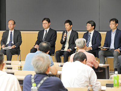 今回の公開講座は、今年7月に発生した九州北部の豪雨災害についての最新情報なども盛り込んだ内容となっており、(1)「西南日本のひずみ集中帯と内陸地震」(西村卓也 防災研究所准教授)、(2)「多様な形態をとった熊本地震での土砂災害」(宮田秀介 同助教)、(3)「近年の地震における地盤の液状化災害」(渦岡良介 同教授)、(4)「洪水予測の先端技術とリアルタイム浸水ハザードマッピング」(佐山敬洋 同准教授)、以上4つの講演を行いました。公演後にはフロアからの質問を受けての総合討論を行いました。