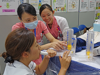 各診療科(部)の取り組みを紹介する「パネル展示」では、業務内容や取り組み、器具の展示・取り扱いについて職員が説明し、来場者の方に現場での活動を知っていただくことができました。また、疾患栄養治療部のインボディーによるメタボチェックや看護部のハンドマッサージなどの「体験コーナー」、さらに医学部附属病院への就職希望者を対象にした「就職相談コーナー」や「見学ツアー」など様々な企画を実施し、将来医療の道を志しておられる方から近隣住民の方まで、たくさんの方にご参加いただき、大盛況のうちにイベントを終えることができました。