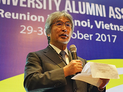 京都大学国際シンポジウムに先駆け、10月29日には、ベトナム人元留学生による同窓生組織「京都大学ベトナム人同窓会(Kyoto University Vietnamese Alumni )」が中心となり、ハノイ市内で同窓会が開催されました。会合にはベトナム人同窓生やハノイ吉田会(在ハノイ日本人同窓会)のメンバー、また山極壽一 総長、北野正雄 理事・副学長をはじめとする本学の教職員、学生など約140名が集い、盛会のうちに終了しました。