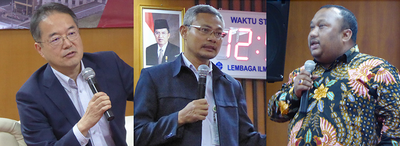 左から、基調講演をする松原理事補、講演するヌルル・タウフィク・ラフマン LIPI研究員、クリヨ・スンボド 3月11日大学教員