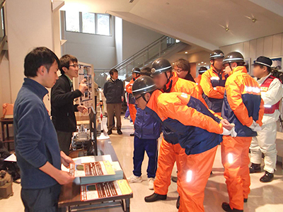 地元消防団員に地震計の原理の説明をする上宝観測所の教職員