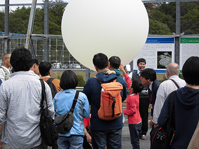 午前と午後の部を合わせて136名の参加がありました。当日は、研究所の教員による信楽とインドネシアにおけるレーダーを使った大気研究についての講演に続き、MUレーダーおよび各種大気観測装置の見学を行いました。最後に、気球を用いたラジオゾンデ観測の実演として、子供を含む来場者と一緒に放球し、上昇していく気球が見えなくなるまで観察しながら参加者との交流を深めました。参加者からは、「MUレーダーの具体的な機器の動作や内部の作りが見れてよかった」、「ラジオゾンデの説明を聞き、夢が膨らみました」などの感想が寄せられ、好評のうちに終了しました。