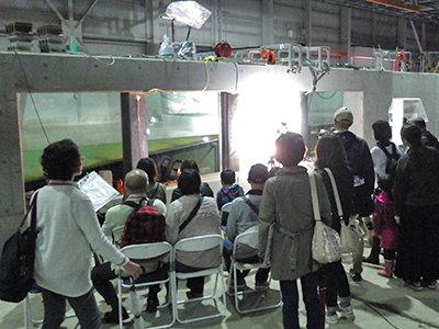 2017年も混雑を回避するために事前予約制を導入し、シャトルバスを増便しました。台風が接近する中、開催自体も危ぶまれましたが、246名の来場がありました。当日は、体験学習など通して、視覚的・感覚的に水の強さや水害の恐ろしさを体験しました。参加者からは、「立派な装置を子供たちにも分かりやすく体験できた」、「災害の怖さを体感した」、「日常では体験できないことを実際に体験できてよかった」などの感想が寄せられ、公開ラボは好評のうちに終了しました。