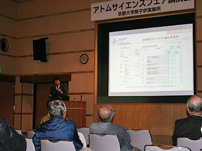 このイベントは、幅広い年齢層の一般の方々に広く科学に興味を持っていただくために、毎年開催しているものです。10月21日に熊取交流センター(煉瓦館)において開催した講演会には、雨天にもかかわらず、61名の参加がありました。「放射線・粒子線治療を支える医学物理最前線」をテーマとして3つの講演を行い、講演後には活発な質疑応答が行われました。「医学物理の分野を知り、その方面の勉強をしてみたいと思った」、「基礎から講義してくださったので、理解しやすかった」等の感想が寄せられ、イベントは好評のうちに終了しました。29日に開催する予定だった実験教室は、台風22号の影響を想定し、中止となりました。