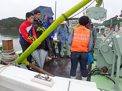このイベントは、瀬戸臨海実験所を知ってもらうため、毎年開催していますが、4年ほど前から、実験所が管理する無人島の畠島見学をプログラムに取り入れ、その自然保護について、理解を深めてもらうことも目的としています。地元の白浜・田辺地域から9名、和歌山市から4名、奈良県から4名、滋賀県から1名の計18名が参加しました。当日は台風22号の接近のため、朝の時点で、畠島行きの予定を実験所の観測船「ヤンチナ」の見学と装備の紹介に切り替えました。まず講義室に集合し、「実験所の歴史と活動」と「畠島の自然保護」について講演を行い、その後、観測船「ヤンチナ」の概略を説明しました。説明終了後、船着き場に移動して、実験所の観測船「ヤンチナ」に乗り込み、レーダーや魚探などの観測機器に加えて、採集器具などを上げ下げするワイヤーフレームを作動させ、採集の雰囲気を体験しました。また帰途には、畠島の対岸の坂田の鼻から、畠島の全景を眺めました。実験所へ帰所後は、水族館のバックヤードを見学し、水族館は自由見学としました。参加者からは、「天候が悪くて、畠島へ上陸できなかったことは残念だったが、船の見学や、水族館のバックヤードなど、日頃見る機会のないものを見られた」との声が寄せられました。