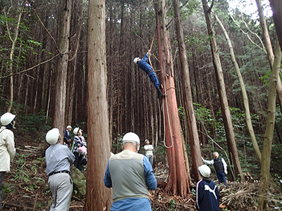 周南・光・山口・柳井市の市民のほか、山口県立田布施農工高校と徳山高校の高校生5名を加えて20名の参加がありました。徳山試験地のヒノキ人工林において、原皮師(もとかわし)の大野浩二氏による檜皮採取の実演を見学しました。作業をしながら、解説や質疑応答が繰り広げられ、参加者は檜皮採取の方法をよく理解することができた様子でした。また、環境調査の基礎である水質分析実習も行いました。試験地側で用意した河川水や井戸水に加えて参加者が持ち込んだ水試料も分析し、結果について皆で検討しました。