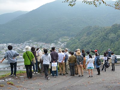 四国の風土に密接に関連した地すべりの実態、およびわが国を代表する活断層である中央構造線による地形変化などを理解してもらうため、2016年に引き続き、2017年も開催しました。当日は定員の30名を超える34名の参加がありました。まず、徳島地すべり観測所に集合し、パネルなどにより観測所を説明し、四国の地質・地形および地すべり分布図を紹介した上で、ボーリングで抜き取ったコア試料を用いて、地すべり土塊の特徴を紹介しました。その後、長期かつ高密度で地すべり計測を行っている西井川地すべり地にて、地すべりの地質・地形・変動特徴を紹介し、種々の地すべり観測機器を説明した上で、リアルタイムで観測した微動および参加者のジャンプで起こした地震動の観測・解析を行いました。また、池田城や白地城の城跡を案内し、歴史と地形についても紹介しました。最後には、中央構造線による池田町における地形変化および断層露頭を見学しました。参加者は、研究内容や体験内容について熱心に質問し、大学の研究者と積極的に対話をして交流を深めました。また、参加者からは、「大変充実したイベントでした」、「観光で訪れたのではわからないことまで十分に知ることができました」、「毎年参加したい」などの感想が寄せられ、イベントは好評のうちに終了しました。