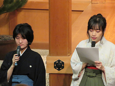 第61回京都大学能楽鑑賞会を、京都市左京区の京都観世会館で開催しました。本会は、創立記念行事音楽会とともに本学学生・教職員のための課外教養行事として毎年開催しているものです。今回は、開演に先立ち、本学能楽部観世会による「見どころ説明」があり、能・狂言の面白さ、見どころについて、英語訳を交えながらわかりやすく説明しました。