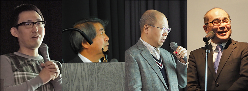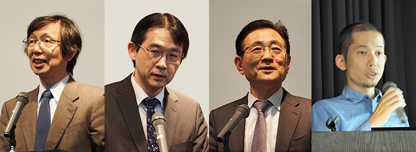 左から、山田所長、西井課長、湊理事・副学長、間野准教授