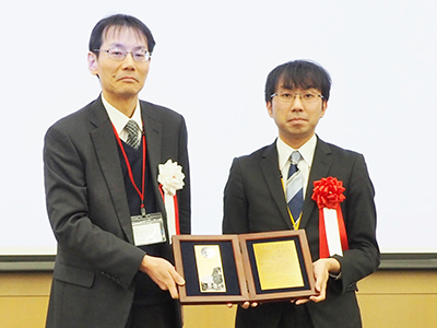 講演会後には「福井謙一奨励賞」の表彰式を行いました。同賞は、基礎化学・理論化学の分野で顕著な研究業績を挙げた若手研究者を顕彰するため昨年度に創設されたものです。今年度は、越智正之 大阪大学理学研究科助教が受賞し、田中センター長より記念盾が贈呈されました。贈呈後は、引き続き越智助教による受賞記念講演が行われました。