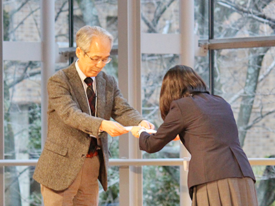 はじめに、進藤修一 大阪大学教育担当筆頭副理事(大阪大学全学教育機構SEEDSオフィス長)の開会挨拶があり、次に受講生による発表が行われました。発表はそれぞれの研究室にて深めてきた探求成果をまとめた工夫のあるものとなっており、活発な質疑応答が交わされました。引き続き優秀賞の発表が行われ、審査員の総合評価により優秀発表賞2件(うち1件ELCAS受講生)、受講生の投票により優秀ポスター賞4件(うち2件ELCAS受講生)が選ばれ、有賀哲也 副学長(理学研究科教授・高大接続科学教育ユニット長)より賞状と記念品が授与されました。最後に有賀副学長より挨拶があり、合同成果発表会は閉会となりました。