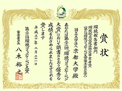 「京都大学環境報告書2017」(2017年9月発行・公開)が、第21回環境コミュニケーション大賞の環境報告書部門において「環境配慮促進法特定事業者賞(第21回環境コミュニケーション大賞審査委員長賞)」を受賞しました。環境コミュニケーション大賞は、優れた環境報告書等を表彰することで、事業者を取り巻く関係者との環境コミュニケーションを促進し、もって環境への取組が一層活性化することを目的に、環境省及び一般財団法人地球・人間環境フォーラムが主催する制度です。