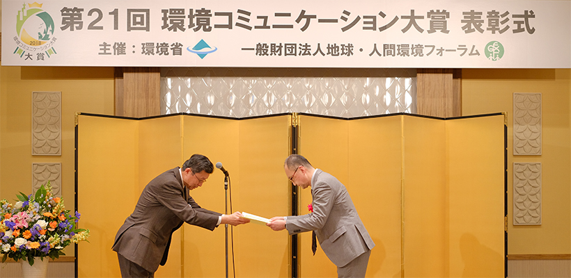 八木裕行 第21回環境コミュニケーション大賞審査委員長(左)より末廣課長(右)への表彰状の授与