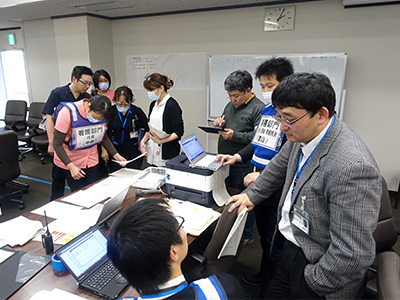 空床状況や患者情報を確認する災害対策本部要員
