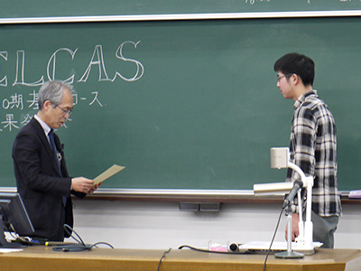 閉講式では、初めに小中優衣奈さん(専修コース受講生代表)より「専修コースを通して幅広い知識と洞察力の必要性を痛感しました。実際に自分が大学院や研究者の道に進んだ時には全く結果の分からない研究を自分の力で進めていかねばならないことがあると思います。望ましくない結果が出た時に大学院生や教授が、どのように考えて行動したかを思い出し、自分なりにその理由を模索したり、改善すべきことを考えて研究を進めたいです」とスピーチが行われました。その後専修コース受講生に有賀哲也 副学長(高大接続科学教育ユニット長)より修了証書が授与されました。続いて基盤コース受講生の各分野代表者に有賀副学長より修了証が授与されました。西林一真さん(基盤コース受講生代表)から「僕がELCASで1番素晴らしく、大切だと思ったことは人との出会いです。自分が興味を持ったことについて、本やインターネットで調べても、同じ分野に興味を持っている人が身近にいるとは限りません。しかし、このELCASには自分と同じ分野に興味を持っていたり、また自分より詳しかったりする受講生がたくさんいます。互いに話し合うことで、より楽しく、刺激を受けることが出来ました」と感想が述べられました。