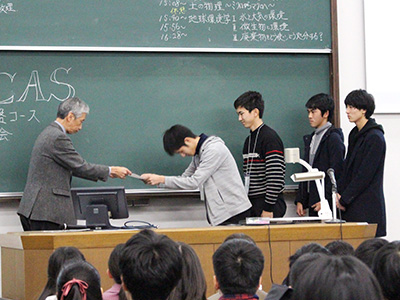 優秀な発表を行ったチームには、受講生による相互評価と教員による総合評価をもとにプレゼンテーション賞を決定し、 村上章 高大接続科学教育ユニット副ユニット長(農学研究科教授)より表彰状と記念品が授与されました。最後に鈴木基史 高大接続科学教育ユニット副ユニット長( 工学研究科教授)より閉式の挨拶があり全員で記念撮影を行い、2017年度のプログラムが終了しました。