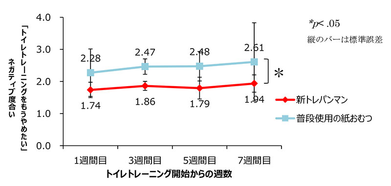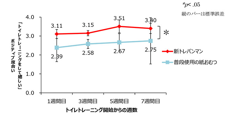 実際、「新トレパンマン」を使用したグループと普段使用している紙オムツを使い続けたグループで2か月にわたりトレーニング効果を比較した結果、「新トレパンマン」を使用した子どもは、使用直後から「トイレでおしっこが成功する」 行動が継続的に促進されました。親の心的変化についても、「新トレパンマン」を使用したグループでは、もう一方のグループに比べて「トレーニングをやめたい」というネガティブな感情が抑制され、「トレーニングをしていて嬉しい」といったポジティブな感情が高まることが明らかとなりました。
