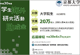 京都大学国際教育委員会国際学生交流委員会では、大学院生がフィールド調査や、国際学会での研究発表、海外での共同研究など研究目的で海外へ渡航するにあたり、学生海外研究活動助成金として資金を支援します。