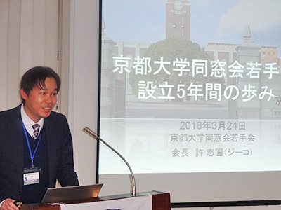 はじめに、許志国(Jico)会長(経済学研究科・2006年修了)より「若手会設立5年間の歩み」について説明があり、その後、岩田奨氏(法学部・2000年卒)が役員に任命されました。これにより若手会は役員7名、名誉会員3名、賛助会員5名となりました。