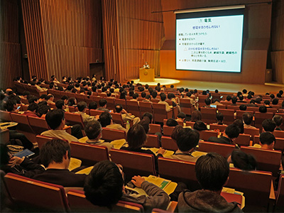 2018年度宇治事業場総括安全衛生管理者に就任した辻井敬亘 化学研究所長による開会の挨拶に始まり、「宇治事業場の安全衛生」、「衛生管理者による巡視とチェックリスト」、「物理実験および計算機関係」、「日々の安全と危険予知等について」、「喫煙問題」、「健康管理・応急手当」、「生物実験および放射線取扱」、「化学物質管理および実験系廃棄物管理」、「実験排水」に関する説明があり、計273名(学生195名、教職員78名)の受講者は熱心に耳を傾けていました。