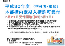 本学では、頻繁に出入構を要する方に対して、事業年度ごとに定期入構許可を行っています。今回、学外の方を対象に、追加で本部構内の定期入構許可証を発行することとしました。構内交通量規制のため駐車場台数内の許可となり、定期入構整理料は月額3000円です。