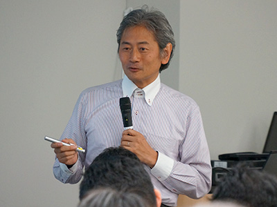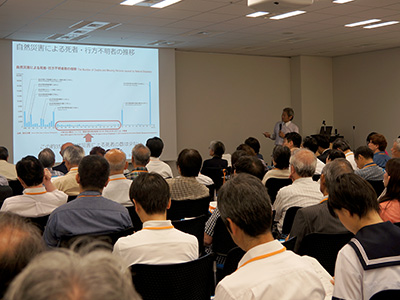 畑山教授は、被災現場で先端的な情報技術がどのように使われているのか、時代毎のICTの進化内容、内閣府の政策の一つであるSociety 5.0、災害現場でのロボットやドローンの活用例を交えながら解説しました。そして、災害現場で収集したデータをどのように活用すれば災害対応につながるのか、熊本地震や焼津津波避難プロジェクトでの活用方法を具体的に示して説明しました。このような取り組みを通じて、情報技術を活用した効果ある防災対策を行うには、新しい技術を積極的に利用した新しい枠組みの構築が必要であると話しました。また、現状の先端技術では鮮度を補償するための情報が多いが、防災・減災で情報システムが役立つためには、鮮度と精度の両方を満たす情報を提供できる技術開発も重要であると言及しました。