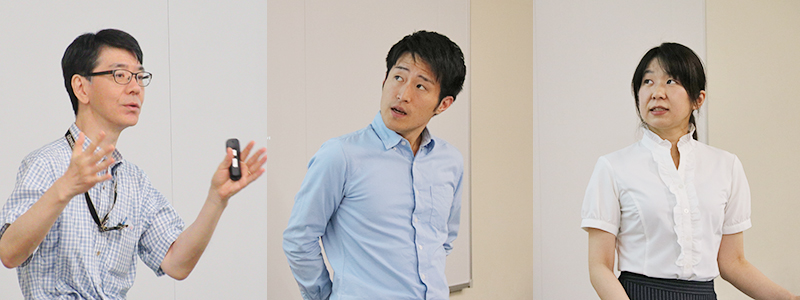左から、講演する佐藤教授、今井研究員、相田研究員
