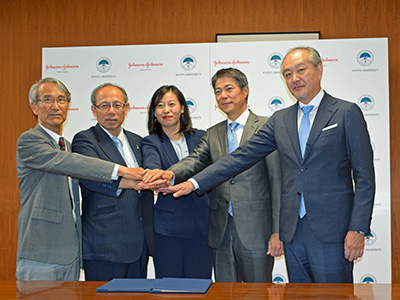 調印式は本学で行われ、上本伸二 医学研究科研究科長、寺西豊 医学研究科特任教授と、ダン・ワン ジョンソン・エンド・ジョンソンイノベーション ヘッドオブアジアパシフィック、 日色保 ジョンソン・エンド・ジョンソン株式会社代表取締役社長、 野中健史 ヤンセンファーマ株式会社研究開発本部本部長が出席しました。
