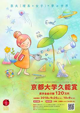京都大学久能賞は、京都大学OGの久能和子氏(工学部1975(昭和50)年卒)、祐子氏(同1977(昭和52)年卒)のお母さまである久能悠子氏からのご寄附により設立されました。悠子氏は、ご自身の学生時代に、科学の道へ進みたいとの思いを抱いておりましたが、その夢は戦争によって叶いませんでした。久能賞には、悠子氏のお二人のご令嬢が京都大学の女子学生として素晴らしい教育を受けることが出来たという感謝の思いと、悠子氏の叶えられなかった夢を今の若い世代の方々に託したいという二つの思いが込められています。
