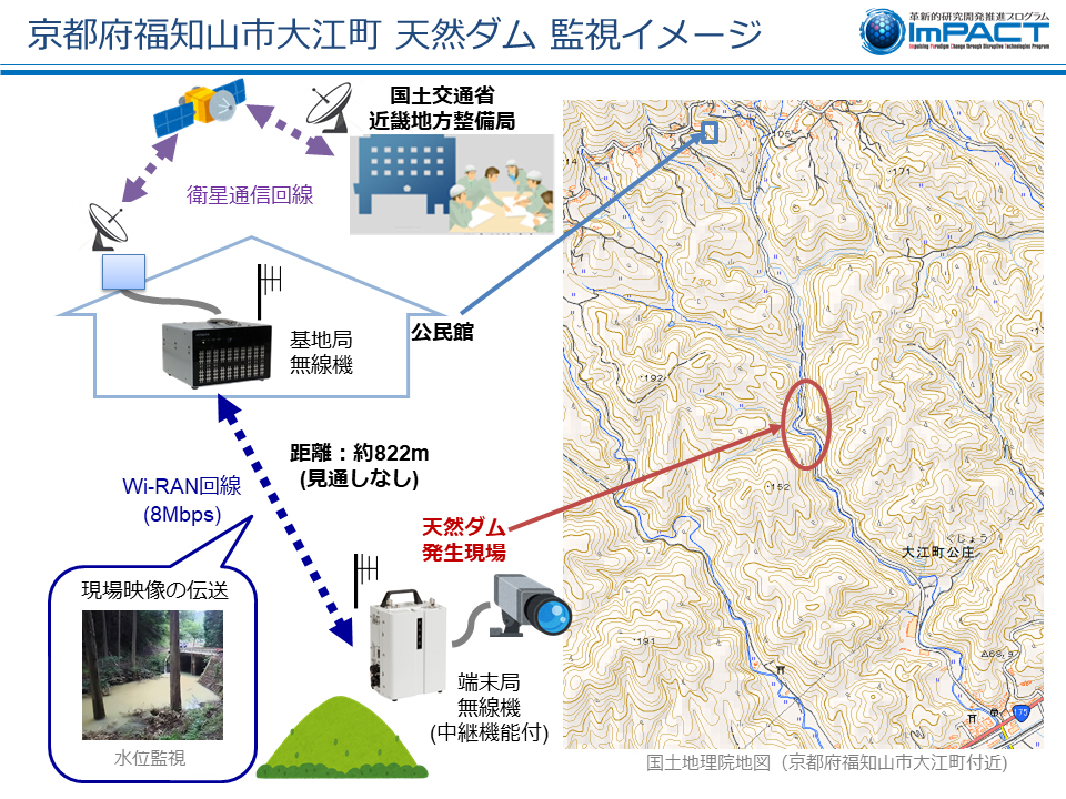 平成30年7月に発生した西日本豪雨災害支援の一環として、国土交通省近畿地方整備局に、京都市福知山市の災害現場(土砂崩れ)において2次災害を監視するための通信システムとして本研究成果が貸与され、7月12日(木曜日)より支援活動を開始しました。