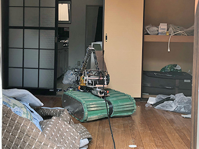 また、FUHGAを前述した全壊家屋と立ち入り禁止となったアパートに投入し、アパートの部屋から住人の貴重品の持ち出しに成功しました。FUHGAは2017、 2018年RoboCup Japan Open レスキューロボット実機リーグで連続優勝、2017年RoboCup世界大会(2018年は不参加)では総合4位およびBest in Class Dexterityを受賞したロボットで、強力で器用なアームが特徴です。