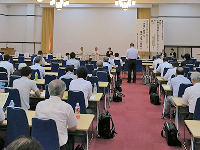 シンポジウムの冒頭、大嶋正裕 工学研究科長が主催者を代表して、「衛生工学科は京都帝国大学の設立と同時に発足した土木工学3講座の1つが発展的に改組され、1958年4月に設立され、関係する研究室は14にまで広がった。これまで様々な環境問題解決に取り組んで来られたが、これからも一層強いリーダーシップを取って、山積する問題解決に向かってほしい。」と挨拶しました。次に、田中宏明 同教授が、廃棄物、水、健康の分野を代表する研究者が将来の環境工学の在り方を議論する趣旨を説明しました。