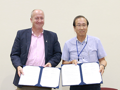 3日は、北川進 iCeMS拠点長、パンディアン講師、ジェフ・リチャーズ AO研究所長、マウロ・アリーニ 同副所長、ストッダート 主任研究者らが出席し、両所の研究者らが見守る中、調印式が行われました。
