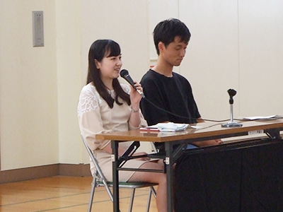 今回はその第一弾として、名古屋市立菊里高等学校(名古屋市千種区)に参加しました。当日は法学部と農学部に在籍する本学学生が、320名を超える後輩たちに向けて、大学生活や下宿、また自身が高校時代に取り組んだ学習方法やどのように高校生活を送っていたかを語りました。高校生達は熱心にメモを取りながら先輩の話に耳を傾けていました。講演後の質疑応答では、「使っていた参考書は?」、「苦手科目の克服法は?」、「睡眠時間は?」など、多岐に渡る質問が飛び交い、時には笑い声も上がったりと、終始和やかな雰囲気となりました。
