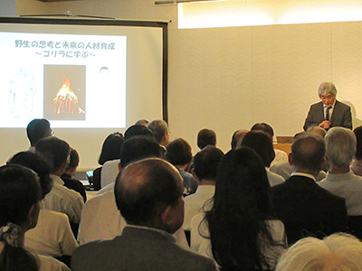 講演では、山極壽一 総長より、「京都大学の未来に向けて」をテーマに、200回例会への祝辞、群れない京大生が群れる意義、サルとゴリラから学んだコミュニケーション力、これからの時代における大学の意義などについて、話がありました。