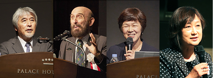左から、挨拶する山極総長、講演するベッカー特任教授、講演する田村教授、パネルディカッションを進行する桑原理事補
