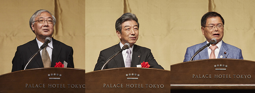 左から、挨拶する小松審議官、山西特別顧問、竹本議員