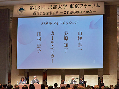 「面白い(おもろい)を探求する -これからのいきかた-」をテーマに、第13回京都大学東京フォーラムをパレスホテル東京で開催しました。今年の出席者は約410名となり、昨年より約100名増えて過去最大の出席者数となりました。当日は、本学卒業生を中心とした国会議員、企業、官公庁の関係者等に多く参加いただき、学内からは山極 壽一 総長をはじめ、理事・副学長、監事、部局長等が出席しました。