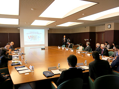 調印式は10月9日に行われ、山極壽一 総長、Antoine Petit CNRS総裁、Minh-Ha Pham パリ科学・人文学研究(PSL)大学副学長、Philippe Queilleエア・リキード 副社長らが出席しました。署名に先立って研究実施責任者の北川拠点長とCNRSのDavid Farrusseng主任研究員が共同ラボの説明を行いました。