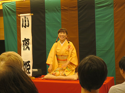 その後は、小夜姫さんによる落語公演があり、日本ならではのお世辞文化を皮肉たっぷりに面白く表現した「子ほめ」と「花嫁修業」の二つの演目を皆で鑑賞しました。母国語も文化的背景も様々な参加者たちが楽しく笑うことで、国境を越えて会場が一つになりました。