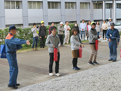 避難訓練後は宇治市東消防署の指導による消火器操作訓練も行い、参加者は熱心に説明を聞き、実際に消火器を手に取って体験しました。