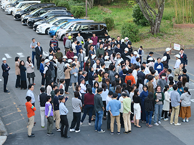 訓練には、教職員で組織する自衛消防地区隊を中心に、その他教職員や学生などキャンパス全体で総勢1,000名以上が参加しました。訓練は、初期消火や安否情報伝達、避難誘導、負傷者の救護、また避難状況の集計等さまざまな場面を設定して行われ、参加者は各自の役割を確認しながら実践しました。また、今回から本学で運用している安否確認システムを使用した情報収集の訓練も行いました。
